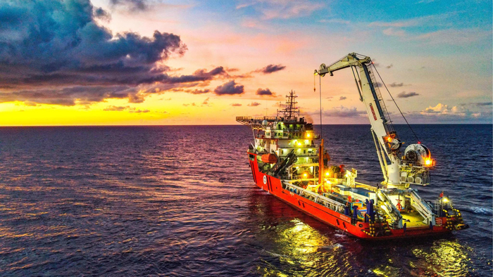 执行本次“源火”采集任务的“海洋地质二号”科考船于2022年4月建成,是我国首艘自主设计建造的大洋钻探船“梦想”号的配套保障船。船长85米,型宽22米,型深8米,排水量7224吨,具备1.2万海里的远洋续航能力及全球作业水平。船上搭载了150吨主动升沉补偿海工吊、万米光纤绞车和地质绞车等先进调查设备,拥有730平方米甲板作业面积及直升机平台,可满足多个大型设备同船布放,为本次深海“源火”采集任务提供高效实施平台。