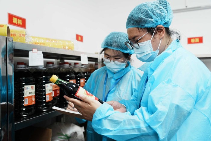 江西省上高县纪委监委采取“派驻纪检监察组+乡镇纪委+职能部门”联动工作机制,对全县中小学校食堂食材质量进行监督检查,督促学校切实规范食堂大宗食品采购工作,从源头保障“舌尖上的安全”。图为该县锦江镇纪委对辖区学校食堂原材料进行抽查。(江西省上高县纪委监委供  邹利强 摄)