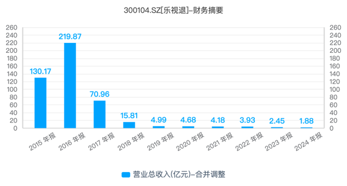 据同花顺iFinD数据,乐视网的业绩在2016达到顶峰后,便开始持续“跳水”。到2024年,公司全年营收仅为1.88亿元,这一数字甚至不及巅峰时期的百分之一,昔日互联网巨头的光环已彻底褪色。