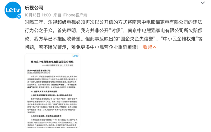 10月13日,乐视公司官博发博,对南京静业家电有限公司(即原南京中电熊猫家电有限公司,简称“中电熊猫家电”)再度进行公开声讨。