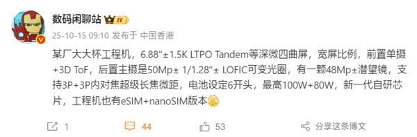 快科技10月15日消息,根据多方爆料,华为Mate 80系列将在11月发布,博主数码闲聊站今天公布了华为Mate 80 Pro+工程机的详细参数。